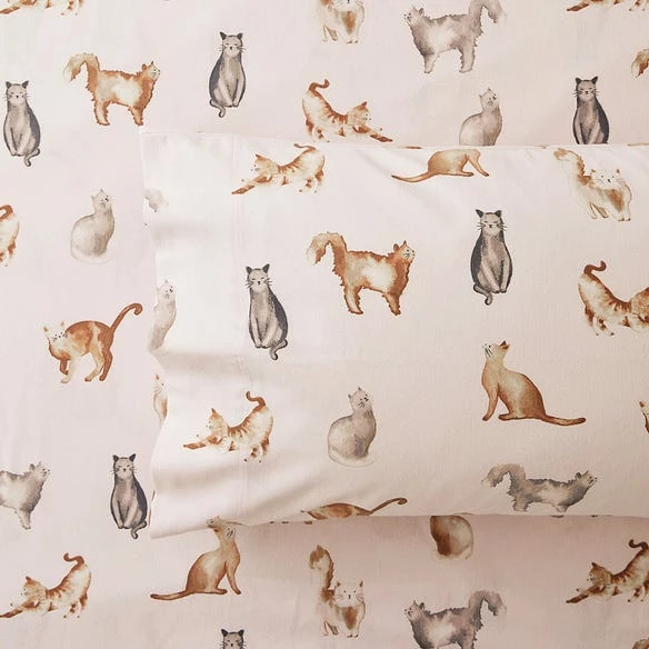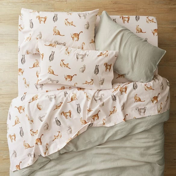 Introduce a playful style with the Cheshire Cats flannelette sheet set in blush. Designed in our Melbourne studio, this sheet set features hand-painted cats stretching and playing, making it perfect for cat lovers. Finished with a twin needle stitch, our high-quality flannelette cotton has been brushed on both sides for added softness and warmth.