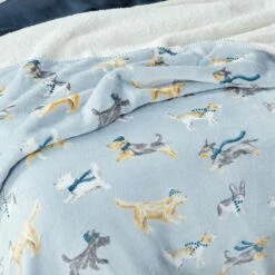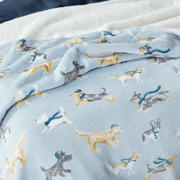 Snuggly and soft, the Cooper Sherpa Blanket is the perfect choice for the cooler months. Printed on plush polyester with a sherpa reverse, this blanket features adorable dogs with scarves and beanies over a dusty blue base.