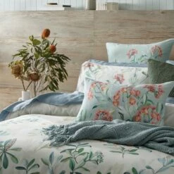 Designed and styled in Australia, contemporary Cotton House designs are perfectly suited to the relaxed Australian way of life. Create a contemporary style in your bedroom with the Currawong quilt cover. Made from cotton, native Australian foliage is featured in soft, calming tones. Coordinate with European pillowcases for a complete look. Enjoy the easy elegance of Cotton House for any setting.