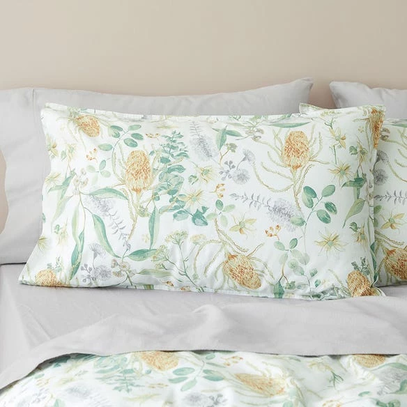 Welcome Australian botanicals into your bedroom with the Donnybrook flannelette quilt cover. Designed in our Melbourne studio, native banksia, bottlebrush, and gum leaves are painted in green, silver grey, and golden yellow ochres. Finished with a twin needle stitch, this design is printed on high-quality flannelette that has been brushed on both sides for extra warmth and softness.