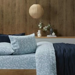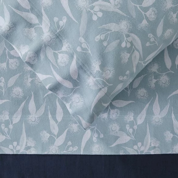 Create a restful oasis this winter with the smoke blue Pemberton flannelette sheet set. Designed in our Melbourne studio, soft silhouettes of eucalyptus leaves have been printed on a pastel background to create a sophisticated style finished with a twin needle stitch. Coordinate with one of our flannelette quilt covers for an ultra-cosy feel.