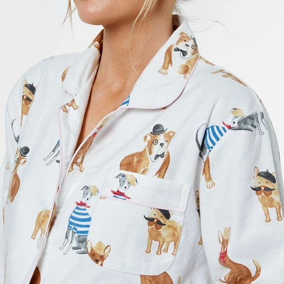Embrace the cooler months with our Reggie flannelette pyjamas. Beautifully soft to the touch, these snuggly pyjamas have been crafted from cotton flannelette, brushed on both sides for extra softness. Featuring dressed up dogs hand-painted in our Melbourne studio, these pyjamas are the perfect winter companion. Available in three sizes, this set is complete with an elasticated drawstring waist and a button-down shirt with collar and pocket details.